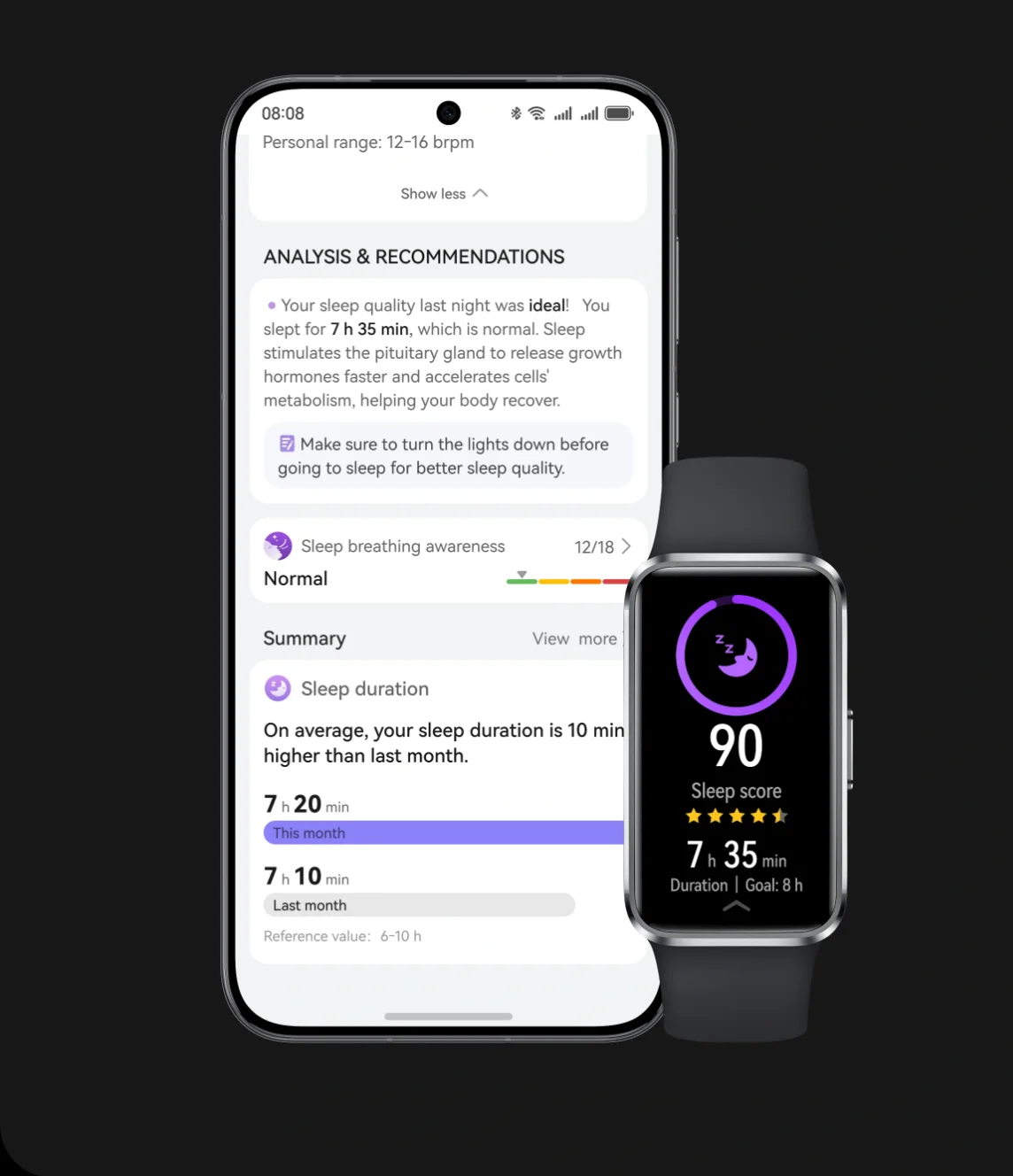 Disponível apenas quando emparelhado com um telefone em execução EMUI 6/Android 9.0/iOS 13.0 ou posterior e instalado com o aplicativo Huawei Health.A disponibilidade real dos recursos pode variar dependendo do modelo do telefone e do sistema operacional.